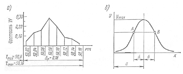 Экспериментально установлено, что при обработке заготовок на металлорежущих станках способом автоматического получения размеров точность обработки подчиняется в большей или меньшей степени закону нормального распределения, который изображается математической кривой Гаусса (рис. 2.2, б), уравнение которой