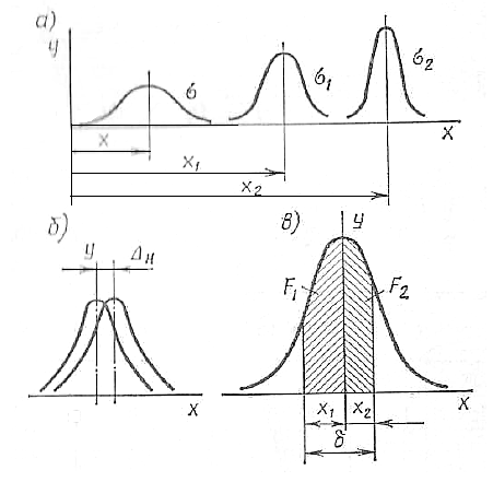 Изучение кривых распределения погрешностей позволяет выявить соотношение между числом годных и бракованных деталей. Предположим, что на обработку заготовок установлен допуск δ. На оси абсцисс (рис. 2.3, в) этот допуск определяется величинами х 1 и x 2 от границ центра группирования. Заштрихованный участок соответствует числу заготовок, находящихся в пределах поля допуска. Отношение площади этого участка к общей площади, ограниченной кривой, определяет вероятность получения годных заготовок, так как площадь, ограниченная кривой нормального распределения, соответствует общему числу заготовок в партии.
