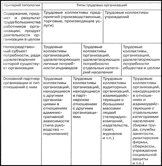 - критерии, используемые для типологии трудовых коллективов: особенности трудовой деятельности или содержание предмета труда и результат труда большинства (основного состава) работников организации и организации в целом, непосредственный социальный субъект потребности, удовлетворяемой основной деятельностью трудовой организации, основной партнер организации и тип отношений с ним;