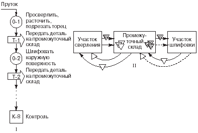Рис..4. Схема организации синхронизированного производства: I - маршрутная схема производственного процесса; II - схема движения контейнеров с картами "канбан"
