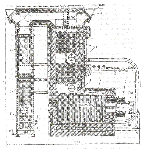 1 – горелочное устройство; 2 – экранированная топочная камера; 3 – фестон; 4 – пароперегреватели; 5 – взрывные клапаны; 6, 8 – воздухоподогреватели; 7 – догреватель топочного газа