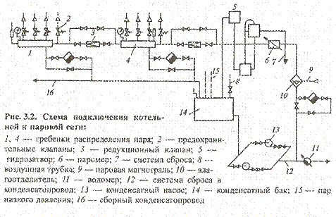Нa рис. 2.2 показана схема подключения котельной к паровой сети через парораспределительный двухступенчатый коллектор. Ступени разделяются редукционным клапаном.