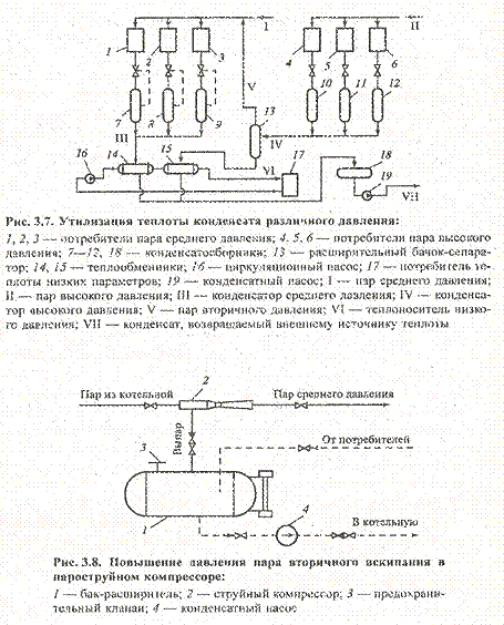 Процесс сжатия пара низкого давления в струйном компрессоре сопровождается подачей пара высокого давления из паровой магистрали. При этом достигается значительное увеличение объема получаемого пара среднего давления. Более подробно эти процессы рассматриваются в гл. 6. Для повышения эффективности работы пароконденсатных систем на промышленных предприятиях· необходимо провести следующие мероприятия: