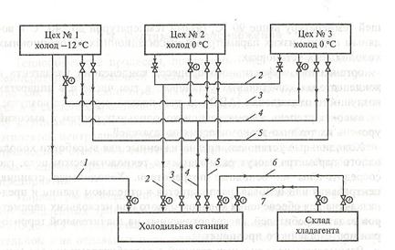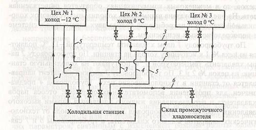 Взаимосвязь холодильных станций с потребителями холода (технологическими цехами) обеспечивается системой трубопроводов посредством циркуляции промежуточного хладоносителя.