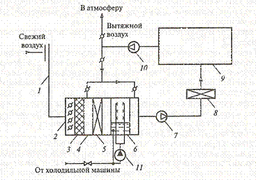 1 – воздухозаборник; 2 – приемная камера; 3 – фильтр; 4 – смесительная камера; 5 – воздухонагреватель первой ступени; 6 – оросительная камера; 7 – вентилятор; 8 – воздухонигреватель второй ступени; 9 – кондиционируемое помещение; 10 – вытяжной вентилятор; 11 – водяной насос
