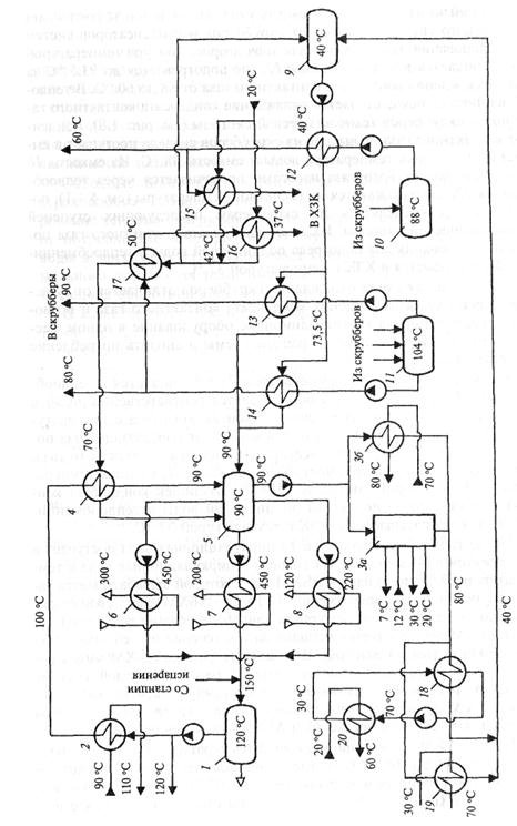Циркуляционная вода температурой 73,5 °С подается в теплообменники 13 и 14, в которых подогревается соответственно до 90 и 80 °С за счет охлаждения конденсата контактного газа с температурой 104 °С. В 13 и 14 используется конденсат контактного газа после скрубберов 7, 15 и конденсатора 9. Конденсат контактного газа, отводимый из скрубберов, поступает в емкость 11, средняя температура воды в которой составляет 104 °С. Излишек конденсата контактного газа после подогрева подпиточной воды в теплообменниках 16 и 17 сбрасывается в ХЗК с температурой 37 °С.