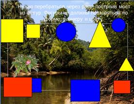 Ребята поняли, что надо перебираться через реку, а для этого нужно выполнить задание: построить мост из геометрических фигур так, чтобы рядом стоящие фигуры не повторялись по форме и цвету.