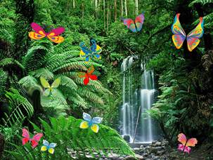 Интересно в тропиках! Вот водопад, а около него кружатся разноцветные бабочки! Сосчитаем их? Попробуйте, найди двух одинаковых!