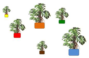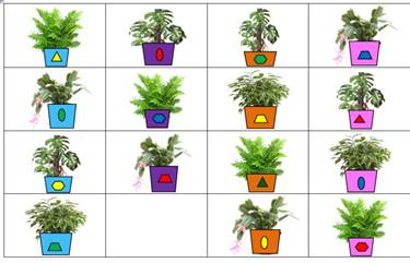 Смотрите, ребята, вот она – полянка, а на ней…ой, как много цветов! Что особенного вы заметили? Правильно, это одинаковые цветы – монстеры. А чем они отличаются? Да, размером и цветом горшка. Давайте поставим их аккуратно, по росту. Молодцы! Какого цвета горшок у третьего по счету цветка? Правильно, красный.