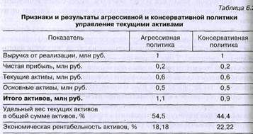 Признаком агрессивной политики управления текущими пассивами служит абсолютное преобладание краткосрочного кредита в общей сумме всех пассивов. При такой политике у организации повышается уровень эффекта финансового рычага. Постоянные затраты отягощаются процентами за кредит, увеличивается сила воздействия операционного рычага, но все же в меньшей степени, чем при преимущественном использовании более дорогого долгосрочного кредита, как это обычно бывает в случае выбора консервативной политики управления текущими пассивами.