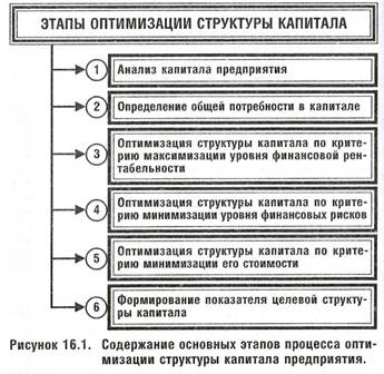 Оптимизация структуры капитала является одной из наиболее важных и сложных задач, решаемых в процессе финансового управления прибылью предприятия. Оптимальная структура капитала представляет собой такое соотношение использования собственных и заемных средств, при котором обеспечивается наиболее эффективная пропорциональность между коэффициентом финансовой рентабельности и коэффициентом финансовой устойчивости предприятия, т.е. максимизируется его рыночная стоимость. Процесс оптимизации структуры капитала предприятия осуществляется по следующим этапам (рисунок 16.1.):