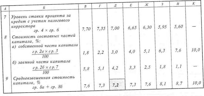 4. Оптимизация структуры капитала по критерию минимизации его стоимости. Процесс этой оптимизации основан на предварительной оценке стоимости собственного и заемного капитала при разных условиях его привлечения и осуществлении многовариантных расчетов средневзвешенной стоимости капитала. Рассмотрим процесс оптимизации структуры капитала по этому критерию на следующем примере: