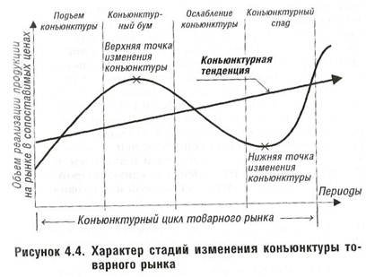 Конъюнктура товарного рынка характеризуется определенными конъюнктурными циклами, в рамках каждого из которых выделяют следующие четыре стадии: 1) подъем конъюнктуры; 2) конъюнктурный бум; 3) ослабление конъюнктуры; 4) конъюнктурный спад (рисунок 4.4.).