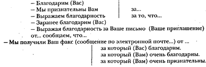 Письмо-благодарность содержит благодарность за что-либо (за полученные образцы товара, каталог, информацию, приглашение, оказанное гостеприимство и т.д.). Здесь употребляются определенные стандартные выражения, например: