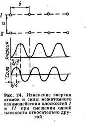 Рассмотрим две соседние атомные плоскости I и II (рис. 24) с межплоскостным расстоянием а. При смещении плоскости I относительно плоскости // в направлении, указанном стрелкой b, каждый атом смещающейся плоскости периодически, после продвижения на величину b, попадает в равновесные положения, неотличимые от исходных. В положениях равновесия (узлах решетки) энергия атомов минимальна, а при смещении плоскости I из положения равновесия на расстояние b /2 эта энергия достигает максимума.