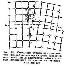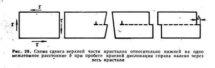 На рис. 25 показаны краевая дислокация внутри кристалла и ступенька на его правой боковой грани, образовавшаяся в результате сдвига справа налево верхней части кристалла относительно нижней, причем зафиксирован момент, когда сдвиг еще не произошел в потенциальной плоскости скольжения левее дислокации. Если под действием сдвигающей силы дислокация будет скользить справа налево, то сдвиг будет охватывать все большую часть плоскости скольжения. Когда дислокация выйдет на левую боковую грань кристалла, здесь образуется ступенька.