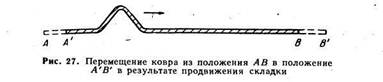 Развитие сдвига в кристалле при скольжении в нем краевой дислокации помогает также понять следующая аналогия (рис. 27). Ковер из положения AB можно переместить в положение A’В’ протаскивая его по полу как единое целое. Точно такой же конечный результат дает продвижение складки от одного края ковра до другого, но в этом случае в каждый момент времени требуется затрачивать меньшее усилие, чем при протаскивании по полу целиком всего ковра. Интересно, что змеи обычно ползают за счет образования складки («положительной дислокации») около хвоста и продвижения этой складки в сторону головы.