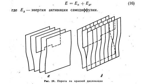 Такой процесс образования порогов — термически активируемый[1]. В условиях термодинамического равновесия при данной температуре Т число порогов на единице длины дислокации где Еп — энергия образования порога (1 эВ для порога высотой в одно межатомное расстояние); п о — число атомов на единице длины дислокации.