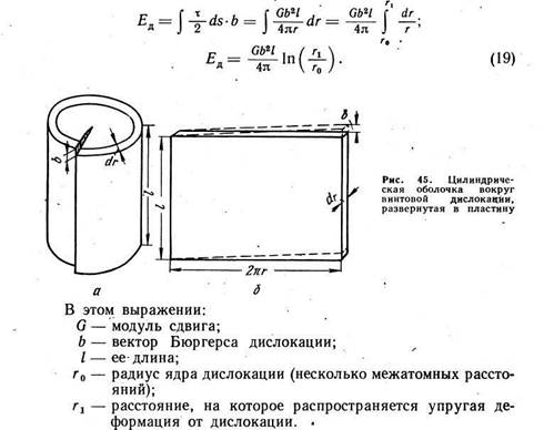 Для оценки энергии винтовой дислокации введем допущение, что в процессе ее образования кристалл ведет себя как упругое изотропное твердое тело. Возьмем такой совершенный кристалл, сделаем в нем несквозной надрез и сдвинем две части этого кристалла одну относительно другой по плоскости надреза на величину b так, как это уже рассматривалось на рис. 29. Такой сдвиг происходит под действием касательных сил и соответствующих напряжений в плоскости надреза. Работа, совершенная этими силами для создания смещения b равна энергии винтовой дислокации