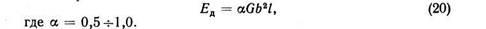 Вполне естественно, что энергия дислокации зависит от вектора Бюргерса, характеризующего степень искаженности решетки, и от модуля сдвига, являющегося характеристикой сил межатомной связи. Чем больше G, тем сильнее межатомные силы сопротивляются смещениям атомов, т. е. больше накапливается упругая энергия искажений решетки.