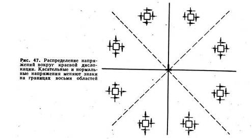 На рис. 47 схематично изображены нормальные и касательные напряжения в разных областях вокруг положительной краевой дислокации. Выделено восемь областей, при переходе через границы которых меняется знак напряжений. Поле напряжений вокруг краевой дислокации не обладает такой простой симметрией, как поле напряжений вокруг винтовой дислокации. С одной стороны от плоскости скольжения имеется область гидростатического (всестороннего) сжатия, а с другой стороны — область гидростатического растяжения.