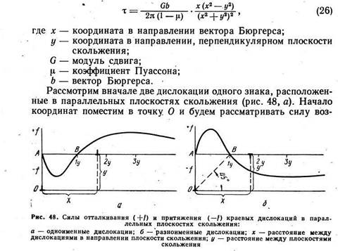 Перейдем к рассмотрению взаимодействия разноименных краевых дислокаций в параллельных плоскостях скольжения, (рис. 48, б). Сила воздействия дислокации, помещенной в точке О, на дислокацию противоположного знака с координатами х, у определяется следующей формулой: