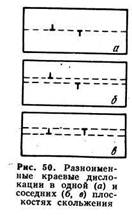 Когда сближающиеся в одной плоскости скольжения (рис. 50, а) дислокации разного знака подходят вплотную одна к другой, они взаимно уничтожаются. Такую аннигиляцию легко себе представить: две экстраплоскости сливаются в единую полную атомную плоскость.
