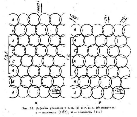 В чередовании плотноупакованных слоев возможны отступления от того порядка, который свойствен г. п. и г. ц. к. решеткам. Прослойку с нарушенным чередованием плотноупакованных слоев называют дефектом упаковки.