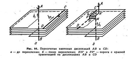 Допустим, что дислокация АВ неподвижна, a CD скользит справа налево. Поверхность скольжения дислокации CD вдали от линии АВ плоская, а с приближением к АВ постепенно искривляется. Соответственно линия винтовой дислокации CD на участке вблизи С постепенно поднимается, а на участке вблизи D опускается. После пересечения с линией АВ дислокация CD разрезается на две части (рис. 94, б): одна часть (СР) лежит на более высоком горизонте геликоидальной поверхности, а другая (P’D) — на более низком. Так как дислокация не может закончиться внутри кристалла, то обе части оказываются соединенными порогом РР’. Этот порог имеет такой же вектор Бюргерса b2 как и вся дислокация CD. Следовательно, порог РР’ имеет краевую ориентацию (вектор Бюргерса ему перпендикулярен).