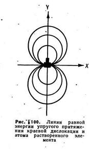 Формула (56) получена в предположении чисто упругого взаимодействия дислокации с примесным атомом. Поэтому ее нельзя использовать для оценки энергии связи примесного атома с дислокацией внутри ядра дислокации, где теория упругости сплошной среды не применима. На рис. 100 показаны рассчитанные по формуле (56) линии равной энергии упругого взаимодействия краевой дислокации с атомом растворенного элемента.