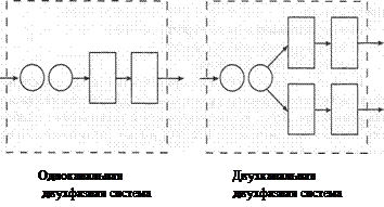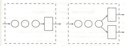 Однофазными являются системы, в которых клиент обслуживается в одном пункте (на одном рабочем месте) и затем покидает систему. Ресторан для обслуживания автомобилистов, в котором официант получает деньги и приносит заказ в автомобиль, является примером однофазной системы. Если же в ресторане нужно сделать заказ в одном месте, оплатить его в другом и получить пищу в третьем, то мы имеем дело с многофазной системой обслуживания (см. рис.)