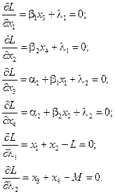 Возьмем частные производные по х 1, х 2, х 3, х 4, l1, l2: