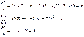 Чтобы найти минимум функции Лагранжа, нужно взять от нее производные по искомым параметрам r, h, l и приравнять их к нулю.
