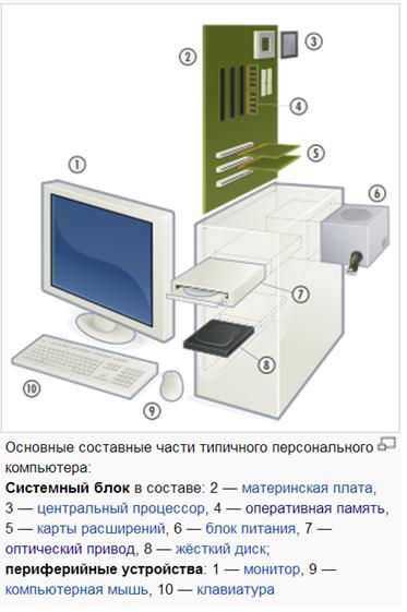 · Вычислительный блок в виде главной/системной/материнской платы с установленным на ней процессором, ОЗУ. Также могут быть установлены картами расширения (видеокарта, звуковая карта, сетевая плата).