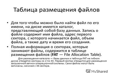 Таблица размещения файлов на диске (FAT, FAT32, NTFS и др.).