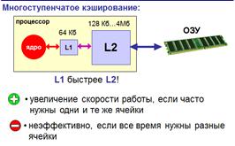 Чтение из ОЗУ – сначала в кэш.Если нужная ячейка уже есть в кэше, она берется из кэша (быстро).