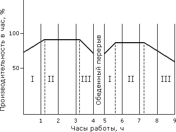 1 – период врабатывания, или вхождения в работу, (0,5 - 1,5 часа), имеет низкие показатели работоспособности.