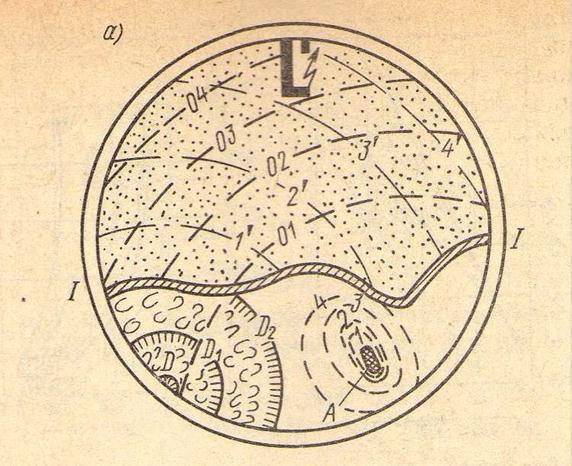 Распространение зоны горения со скоростью, превышающей скорость звука, приводит к образованию ударных волн 01,02,03,04. Обычно ударные волны не вызывают сами по себе детонационного горения. Однако вследствие отражения ударных волн от стенок и их наложения при условии, что в местах их прохождения имеется еще не прореагировавшая полностью смесь, возможно возникновение детонационной волны. D,D1,D2 – возникновение и распространение детонационных волн; 1', 2',3',4' – отражённые ударные волны