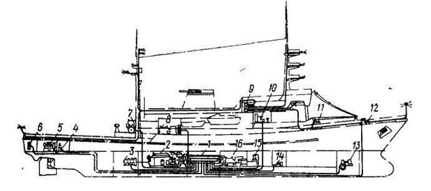 1 - главный электрораспределительный щит; 2 - главный двигатель; 3 – механизм изменения шага винта; 4 - кормовой шпиль; 5 - рулевая машина; 6 - распредели-