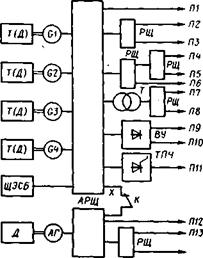 ляется через кабельную перемычку (3-жильный кабель) Х, в рассечке которой находится контакт К мощного контактора. Катушка этого контактора питается непосредственно от шин ГРЩ, поэтому при наличии напряжения на шинах ГРЩ контактор включен и его контакт замкнут. По перемычке электроэнергия передается в направлении от основной электростанции к аварийной. При обесточивании ГРЩ контактор теряет питание и его контакт К, размыкаясь, разъединяет шины АРЩ и ГРЩ.
