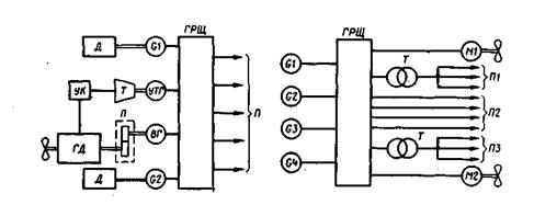 Приемники получают от ГРЩ электроэнергию непосредственно (П1), через РЩ (П2-П6), через понижающий трансформатор Т и РЩ (П7-П8), а также преобразователи электроэнергии - выпрямительное устройство ВУ или тиристорный преобразователь часто