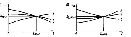 ния от тока нагрузки при номинальной частоте вращения и постоянных значениях напряжения на выводах генератора и коэффициента мощности, т. е. т.е. I