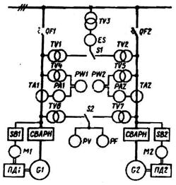 ностям генераторов и контролируют при помощи киловаттметров РW1 и РW2, обычно включаемых через трансформаторы тока ТА1 и ТА2 и напряжения ТV4 и TV5.