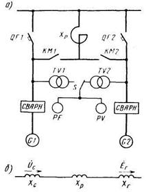 Рис. 3.16. Схемы грубой синхронизации (а) и замещения для одной фазы (б)