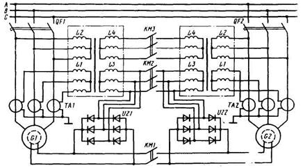 ными обмотками L3 компаундирующих трансформаторов. При замыкании контактов КМ2 эти обмотки соединяются параллельно, поэтому изменение напряжения на одной из них вызовет такое же изменение напряжения на другой.