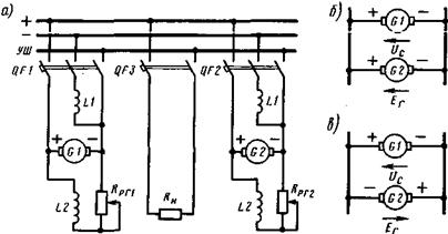 Рис. 3.24. Принципиальная схема параллельной работы генераторов постоянного тока смешанного возбуждения (а), схемы замещения цепей обмоток якорей при соответствии (б) и несоответствии (в) полярности шин и генератора