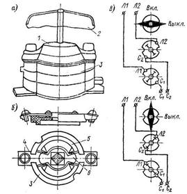 а – общий вид; б – пакет выключателя; в – схема; 1 – крышка; 2 – рукоятка; 3 – изоляторы; 4 – неподвижные контакты; 5 - фибровые шайбы; 6 – подвижные контакты