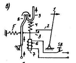 1 – рукоятка включения; 2 – удерживающий рычаг; 3 – отключающий рычаг; 4 – регулировочная пружина; 5 – отключающая пружина; 6 – катушка; 7 – якорь; 8 – подвижный контакт; 9 – неподвижный контакт