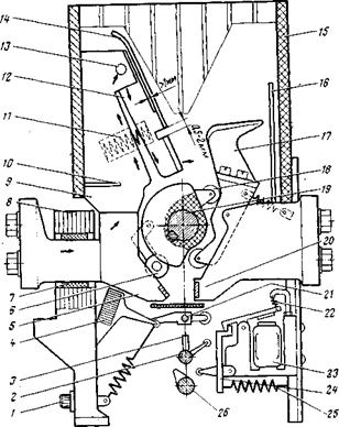 ный на него кулачок через отводку с роликом возвращает рычаг 24 в исходное состояние. Собачка якоря расцепителя вновь удерживает рычаг 24.