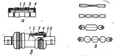 ном или нескольких местах (рис. 4.27, в). Такая конструкція обеспечивает перегорание вставки при коротких замыканиях в суженных местах, т.е. деление дуги на части, что спо-